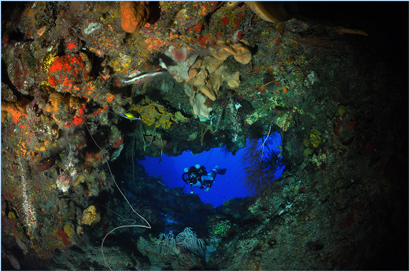 Holding your descent, you’ll notice the playful nudge of the placid current accompany you as you turn to observe the magnificent wall formations that curve sharply along the contour of the island. You’ll observe the strange and mysterious long arms of the black corals jutting away from their rocky anchors, bridging into the clear blue water. While noting how they oddly resemble the fruitless branches of autumn’s barren trees. Occasionally, a curious, lonely lobster will peek out to observe your presence, stretching out their antennas, keenly detecting your vibe as they purposely watch you swim past.