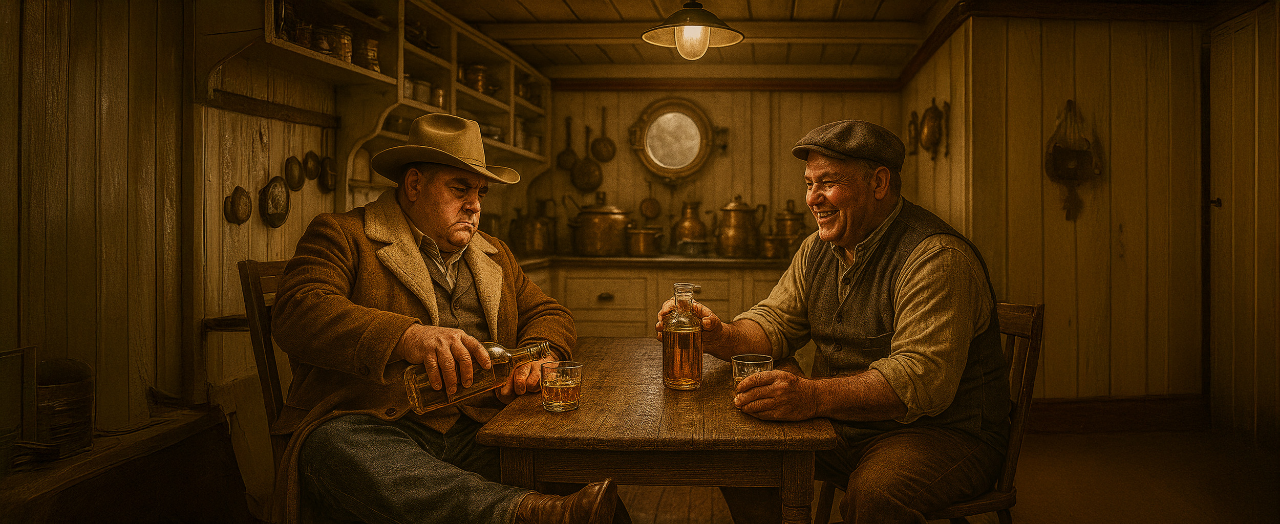 In the galley, Don Wallace sat heavy in a chair, boots stretched out, his broad hat pushed back. Across from him, George Maurice Lambert grinned as Wallace cracked the seal on a fresh bottle of scotch. Glasses clinked, their laughter muffled by the hum of machinery and the muffled thudding of cattle hooves below decks.