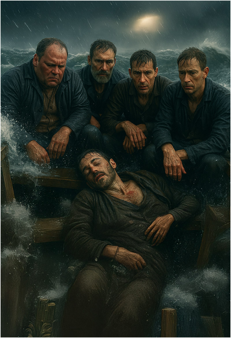 The lifeboat drifted on, five men alive, but hope thinning with every crashing wave.