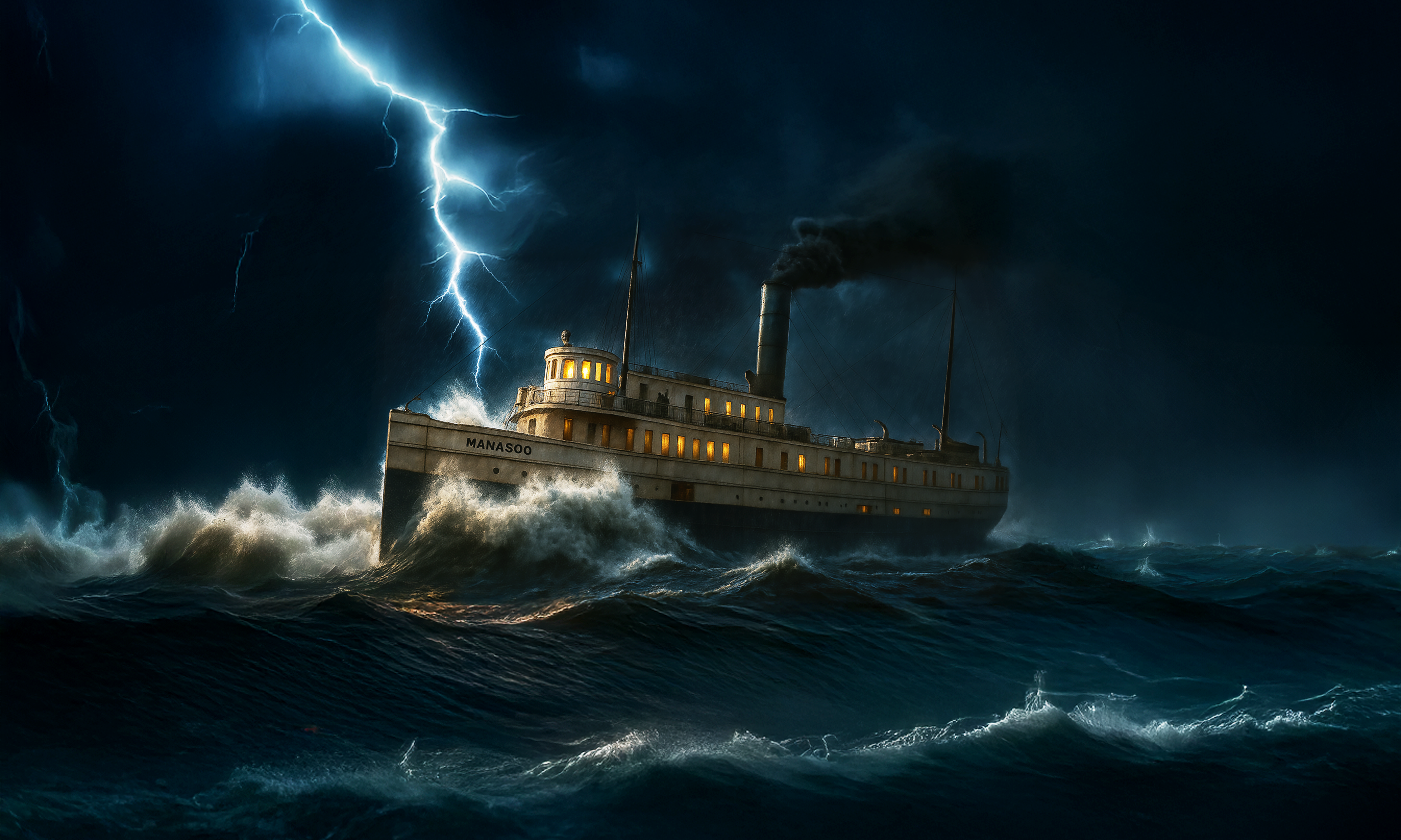 Then came the final shudder. The Manasoo’s bow lifted high, then dropped beneath them in a violent plunge. The lifeboat tore away into the storm, tossed like a chip of wood in the raging lake.