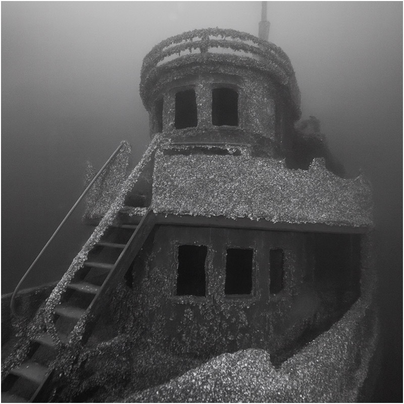 Swimming slightly forward of the bow and gazing back at the wreck, it looks very much like a ghost ship that could continue steaming on if suddenly lifted from the water. The starboard side railing leading up to the wheelhouse, which unfortunately has since fallen, was once strangely devoid of mussels or growth, as if scrubbed by unseen hands. Some of us joked that ghosts kept it clear, though it was probably due to the type of metal used in the railing. Still, it makes for good folklore.