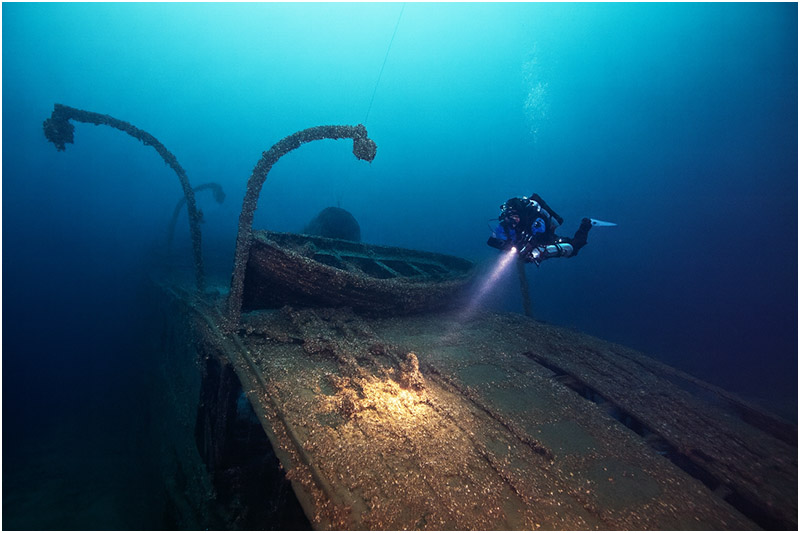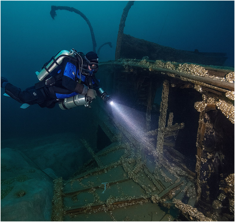 As with most deeper Great Lakes wrecks, the bottom temperature is a brisk 39°F (4°C). However, Lake Huron’s thermocline can be surprisingly warm depending on the time of year. Most of our decompression stops above 70 ft were spent in balmy 65°F water. In addition, the water is usually crystal clear, with visibility of 50–100 ft (15–30 m) not uncommon.