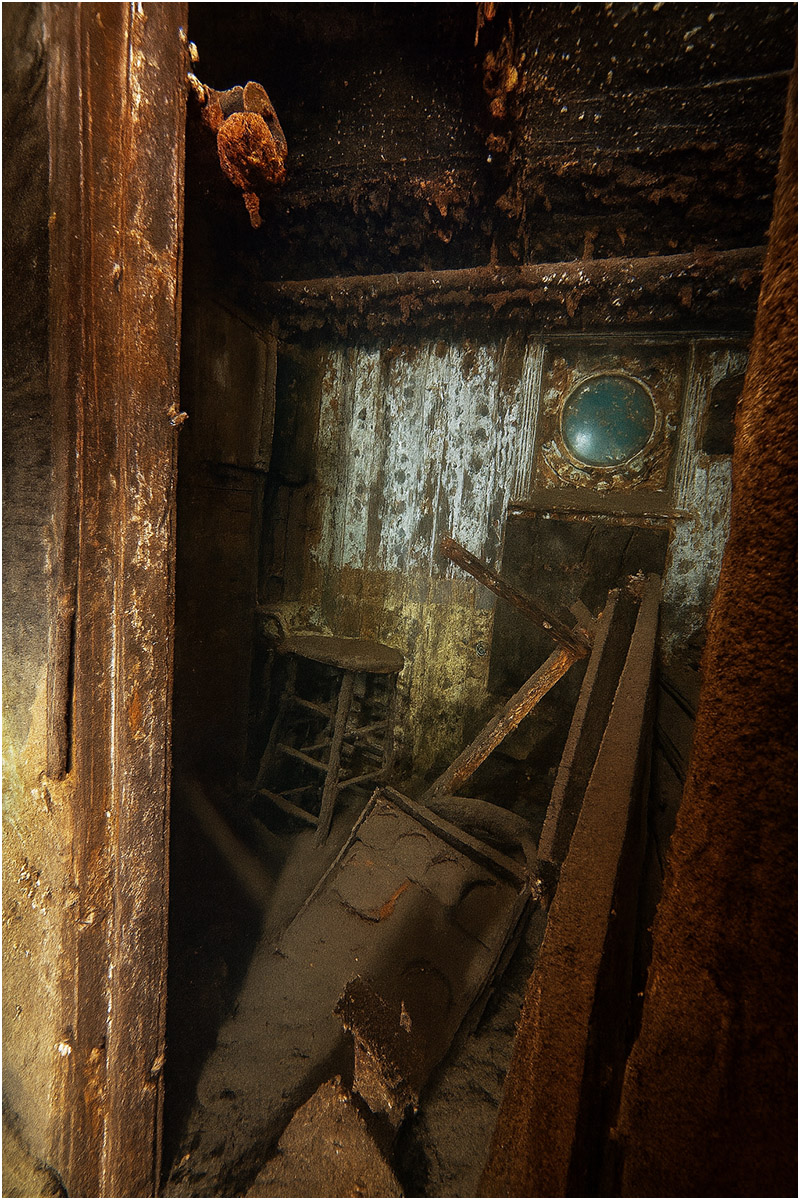 Inside the wreck, white paint still adheres to the walls as you move forward past passenger staterooms down to the engine room and cargo hold. Light bulbs and hanging chandeliers remain in place. Beyond the engine room, moving forward, you’ll encounter the remains of cattle bones and preserved carcasses.