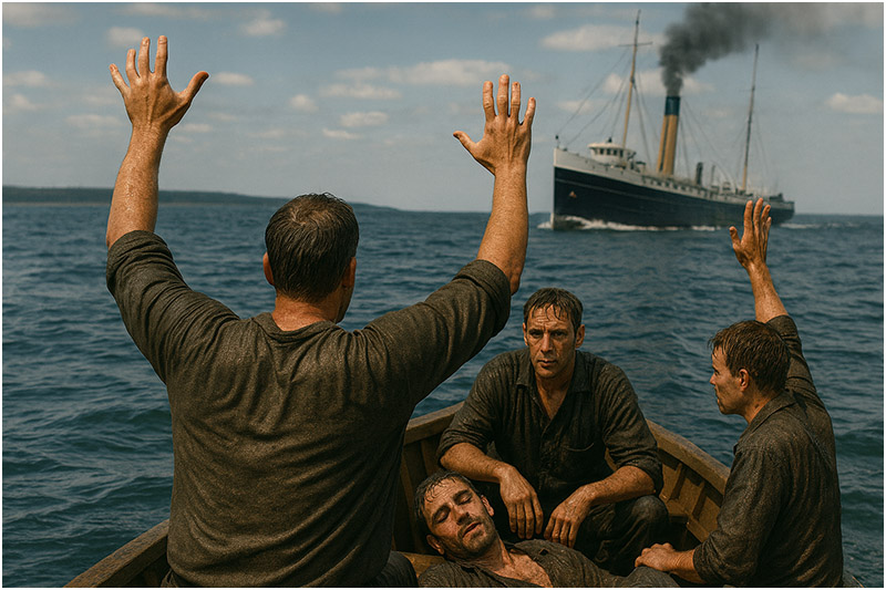 The next morning brought a fragile calm. The storm had eased, leaving only long, rolling swells that lifted the lifeboat skyward and dropped it down again, over and over. The men were silent, their faces hollow, eyes staring at the endless horizon. No sails, no smokestacks—only water.
