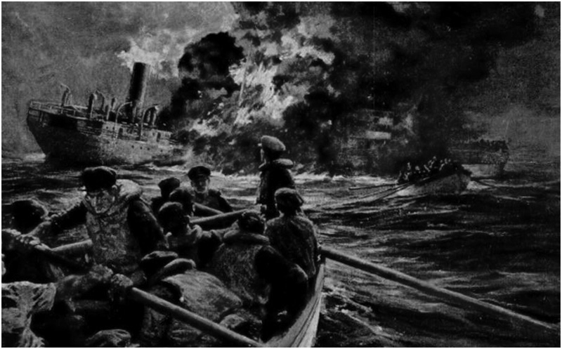 Oars in the water, the frantic crew of the Papoose push their life boats from the side of the ship when the second torpedo smashes into the ship’s stern. A massive explosion splinters the side of the vessel, knocking several of the escaping crew from their lifeboats and into the churning waters. Fire engulfs the engine room as the ship quickly rolls onto its damaged side, narrowly missing the lifeboats.